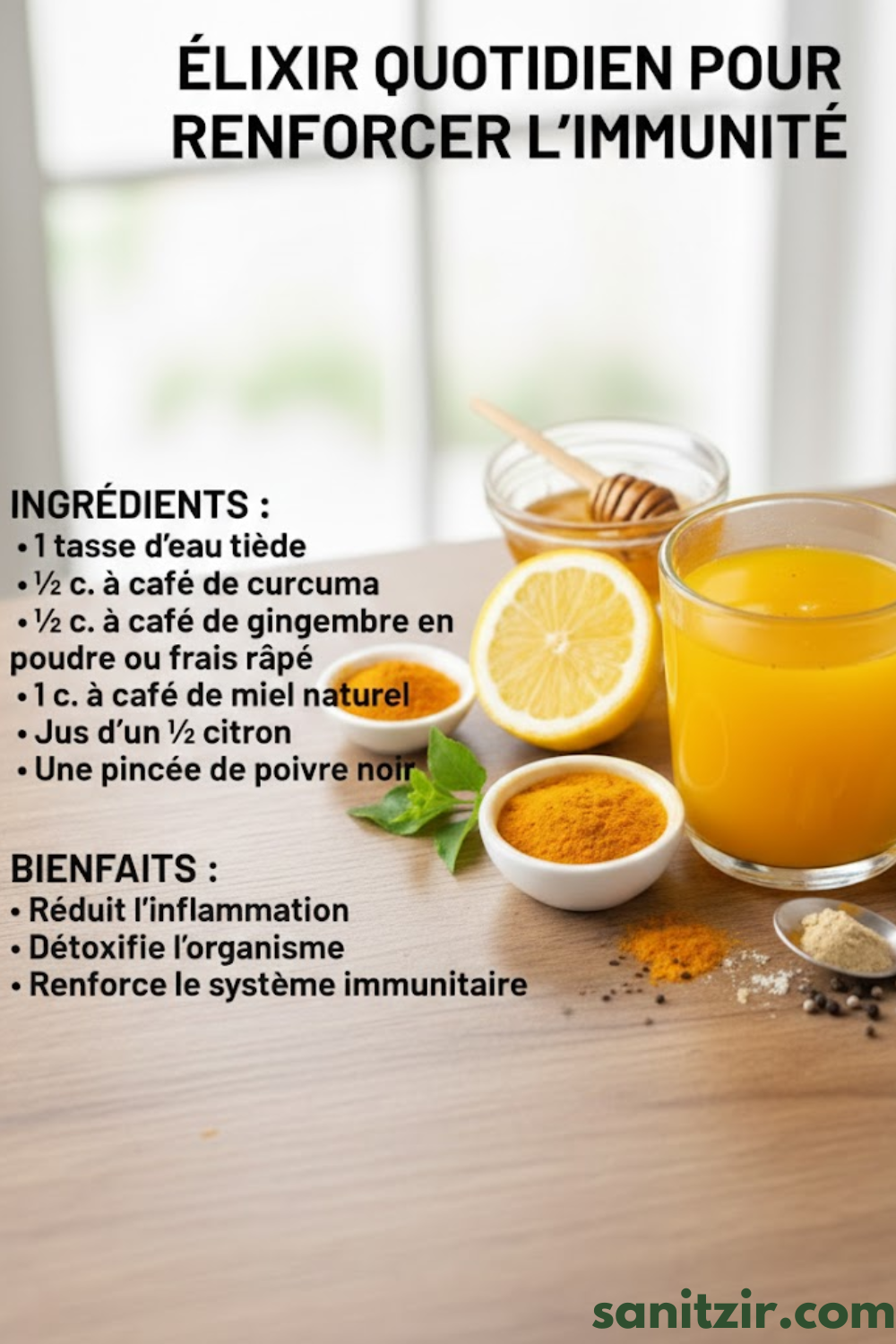 Associé à une pincée de poivre noir, il est mieux assimilé par l’organisme, ce qui renforce l’efficacité de l’🍋 Élixir quotidien pour renforcer l’immunité.